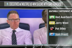 比赛期间,电视转播商晒出了一项数据,雷霆总经理普雷斯蒂执掌两套完全不同的阵容都打出60+胜场赛季,他是历史上第4个能做到这一点的GM,之前三人是奥尔巴赫、杰里-韦斯特和帕特-莱利。