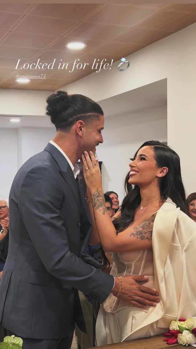 昨晚,北京国安的葡萄牙外援后卫拉莫斯与妻子更新社媒晒照,两人在亲友见证下正式完婚甜蜜拥吻,附文“锁定终身!💍”。